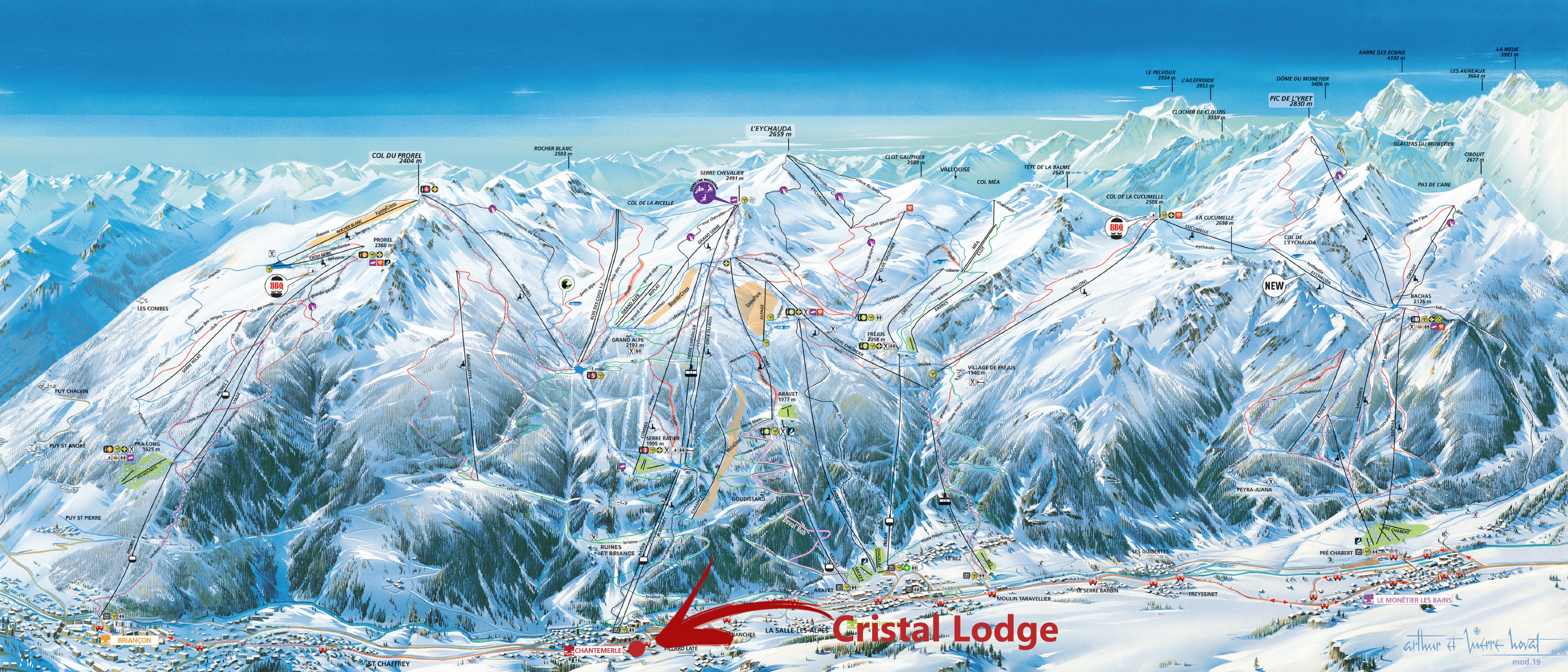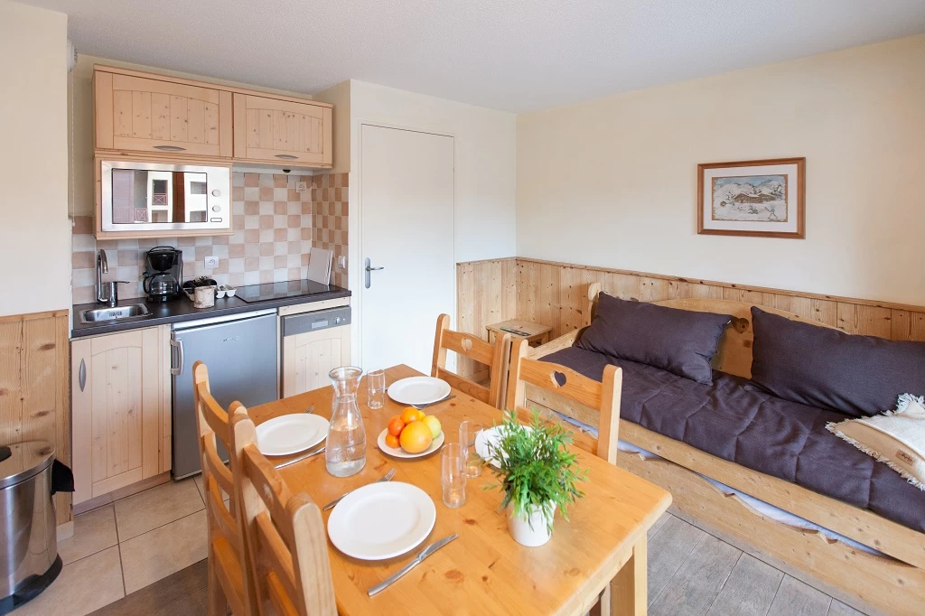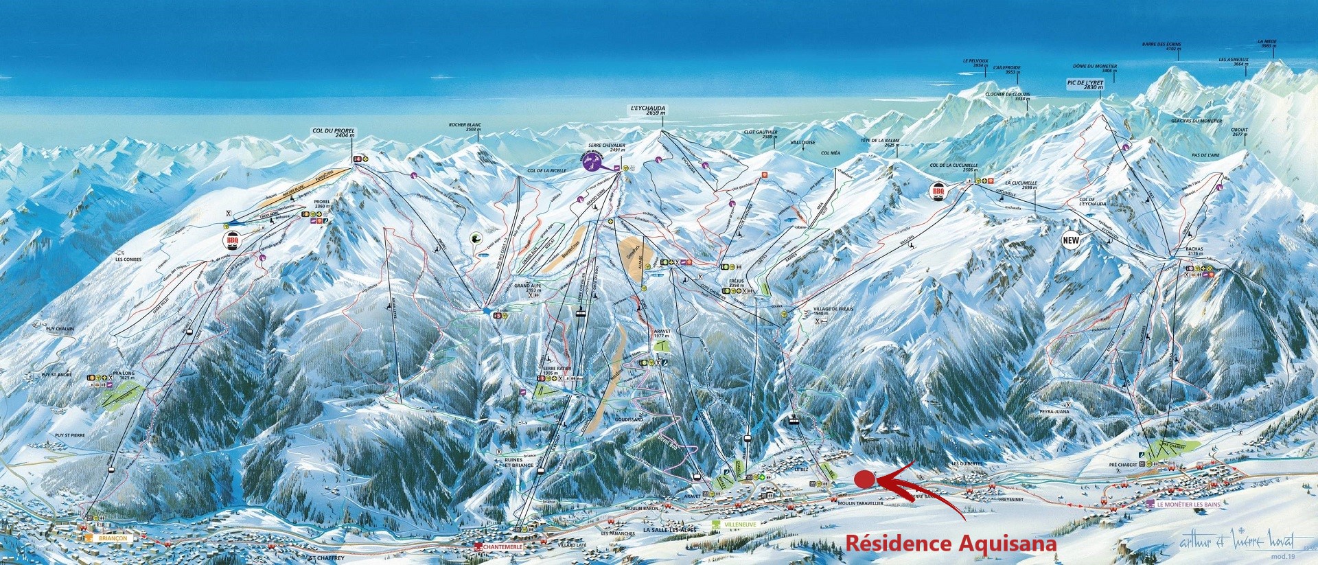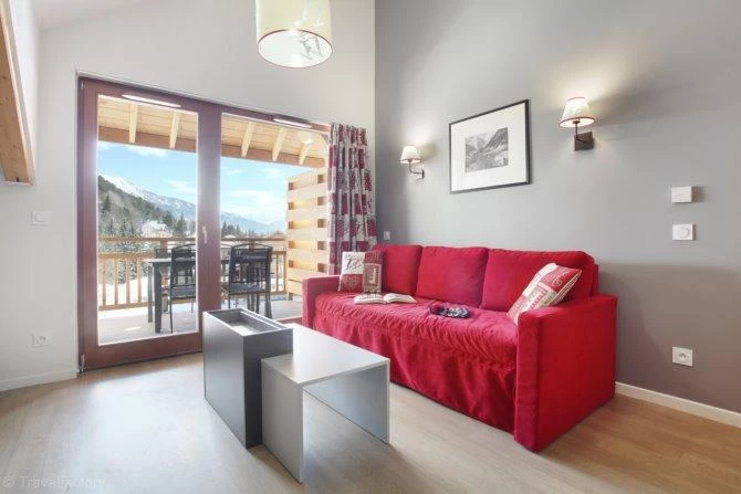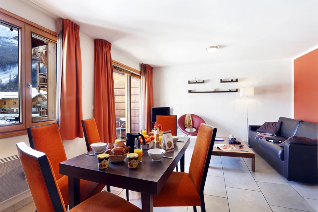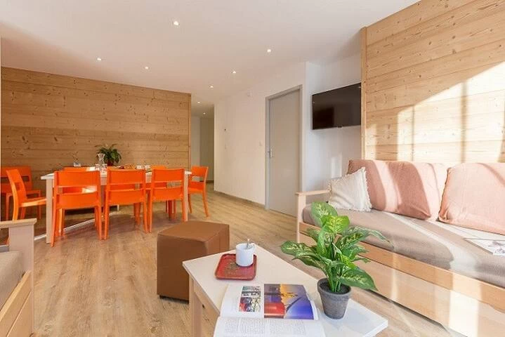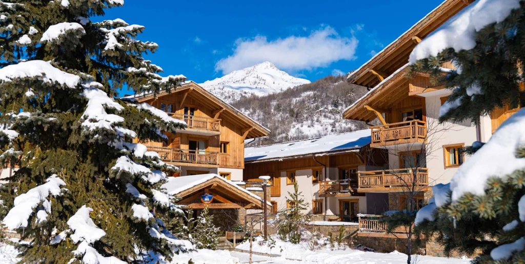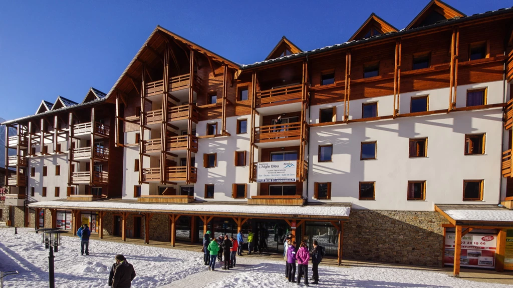 Villeneuve faluban található ez a magas színvonalú szálláslehetőség, a völgyben hosszan elterülő pályarendszer középső részénél. Új építésű, bőven a szokott francia színvonal fölött, sokkal tágasabb apartmanokkal és modern berendezéssel. Három csillag helyett reálisan négyet érdemelne. Fűtött benti medence (az árban), gőzfürdő (6€/alkalom), és ingyenes fitneszterem is várja az aktívan pihenni vágyókat. A legközelebbi lift 300m séta, viszont majdnem egészen a szállásig tudtok csúszni a nap végén egy hazacsúszó pályán. Ha ez a pár perc séta sok lenne: egész nap jár egy Odalys feliratú busz, ami 2 perc alatt a a síterep legújabb kabinos liftjének tövébe (vagy onnan vissza) gurít titeket. Innen tehát meglepően gyorsan a szélesen elterülő síterep közepén találhatjátok magatokat!