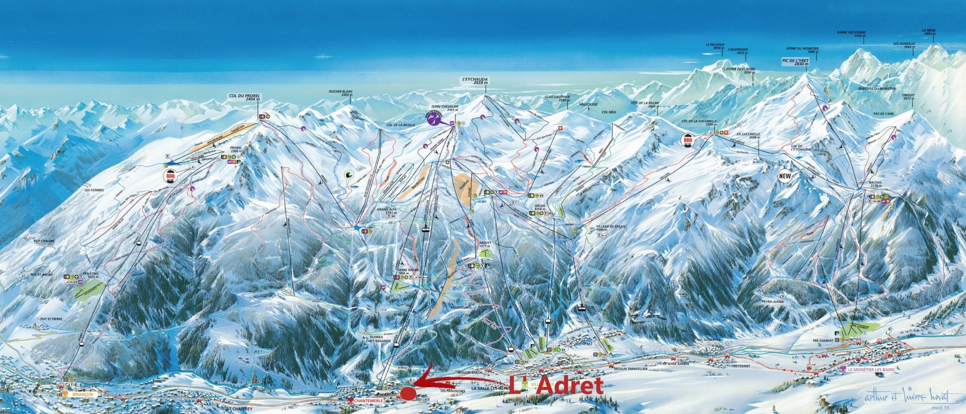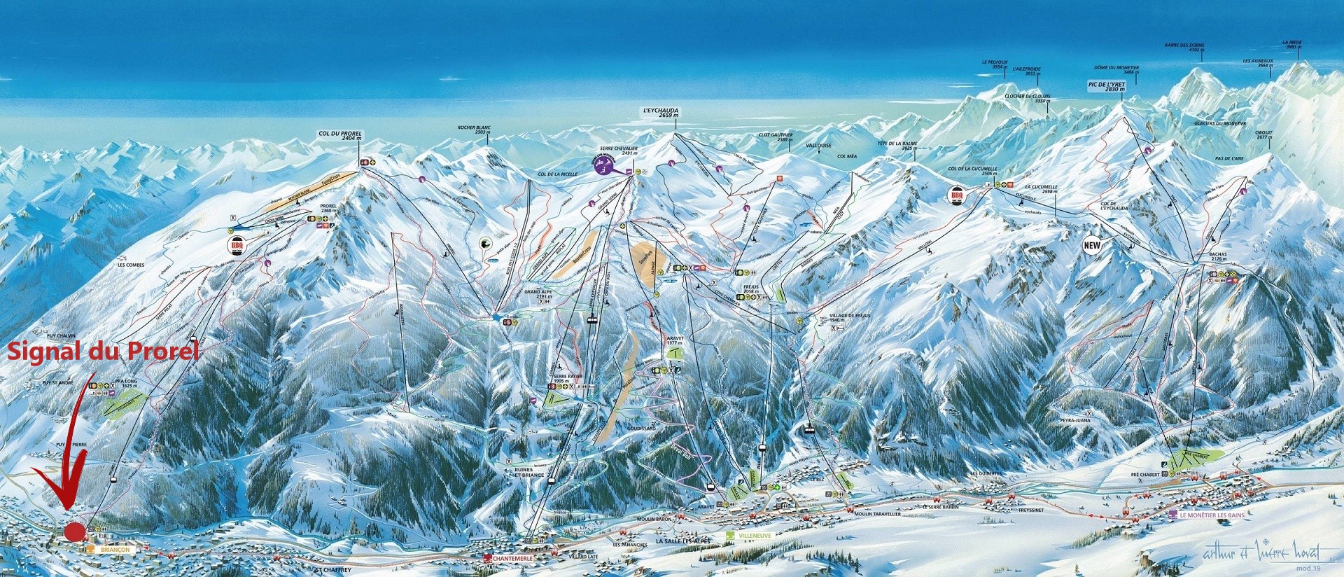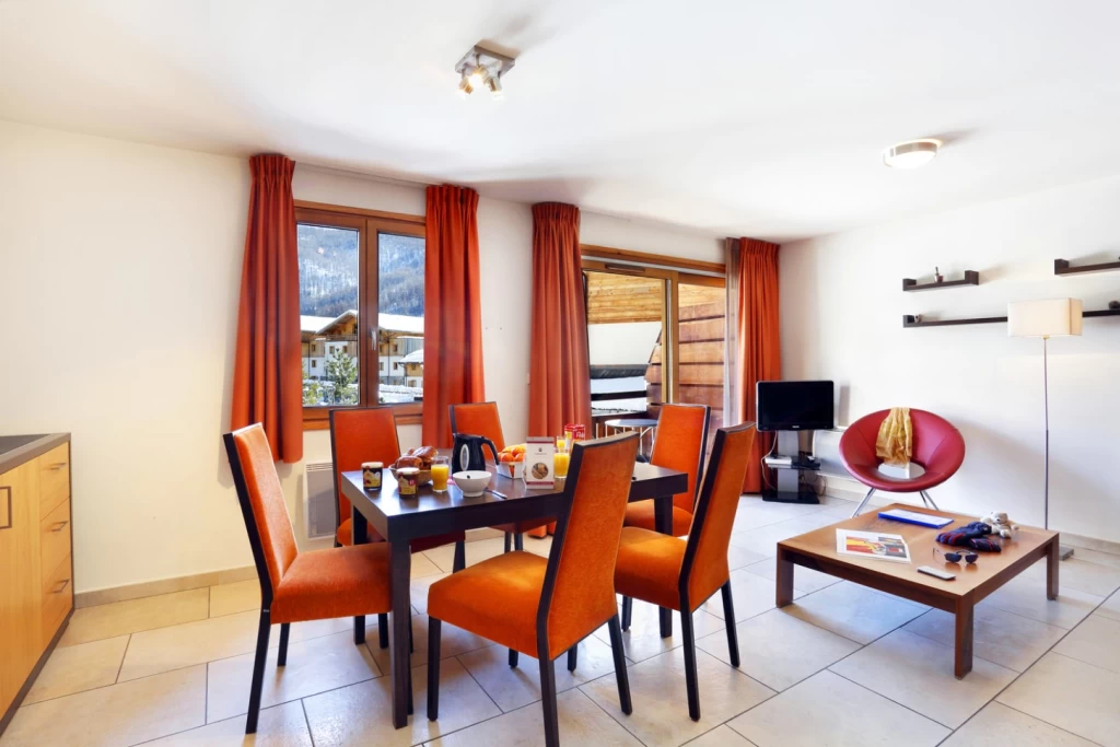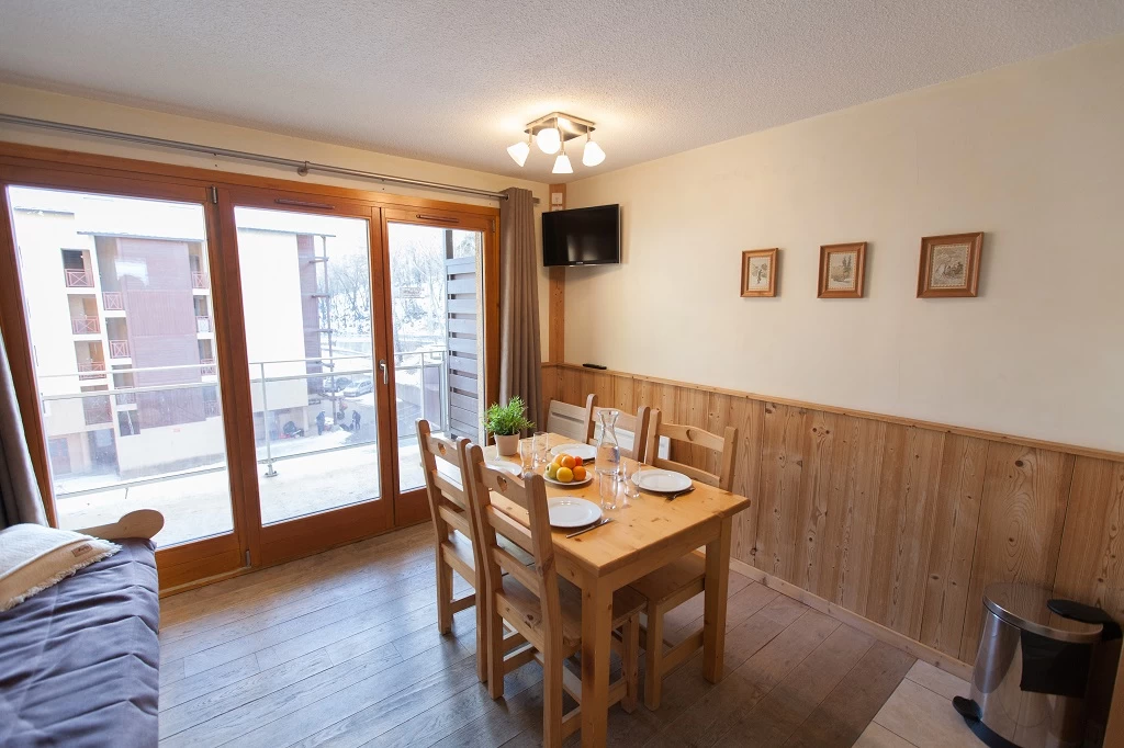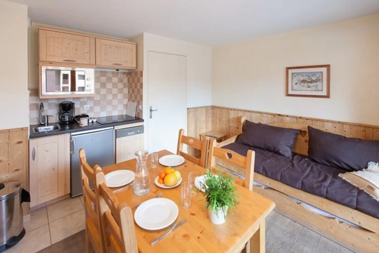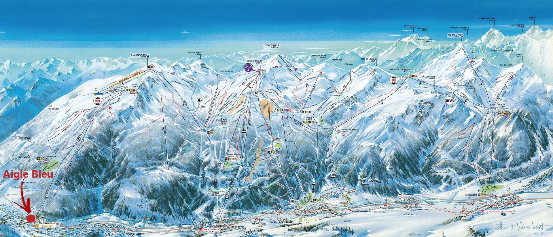 Villeneuve faluban található ez a magas színvonalú szálláslehetőség, a völgyben hosszan elterülő pályarendszer középső részénél. Új építésű, bőven a szokott francia színvonal fölött, sokkal tágasabb apartmanokkal és modern berendezéssel. Három csillag helyett reálisan négyet érdemelne. Fűtött benti medence (az árban), gőzfürdő (6€/alkalom), és ingyenes fitneszterem is várja az aktívan pihenni vágyókat. A legközelebbi lift 300m séta, viszont majdnem egészen a szállásig tudtok csúszni a nap végén egy hazacsúszó pályán. Ha ez a pár perc séta sok lenne: egész nap jár egy Odalys feliratú busz, ami 2 perc alatt a a síterep legújabb kabinos liftjének tövébe (vagy onnan vissza) gurít titeket. Innen tehát meglepően gyorsan a szélesen elterülő síterep közepén találhatjátok magatokat!