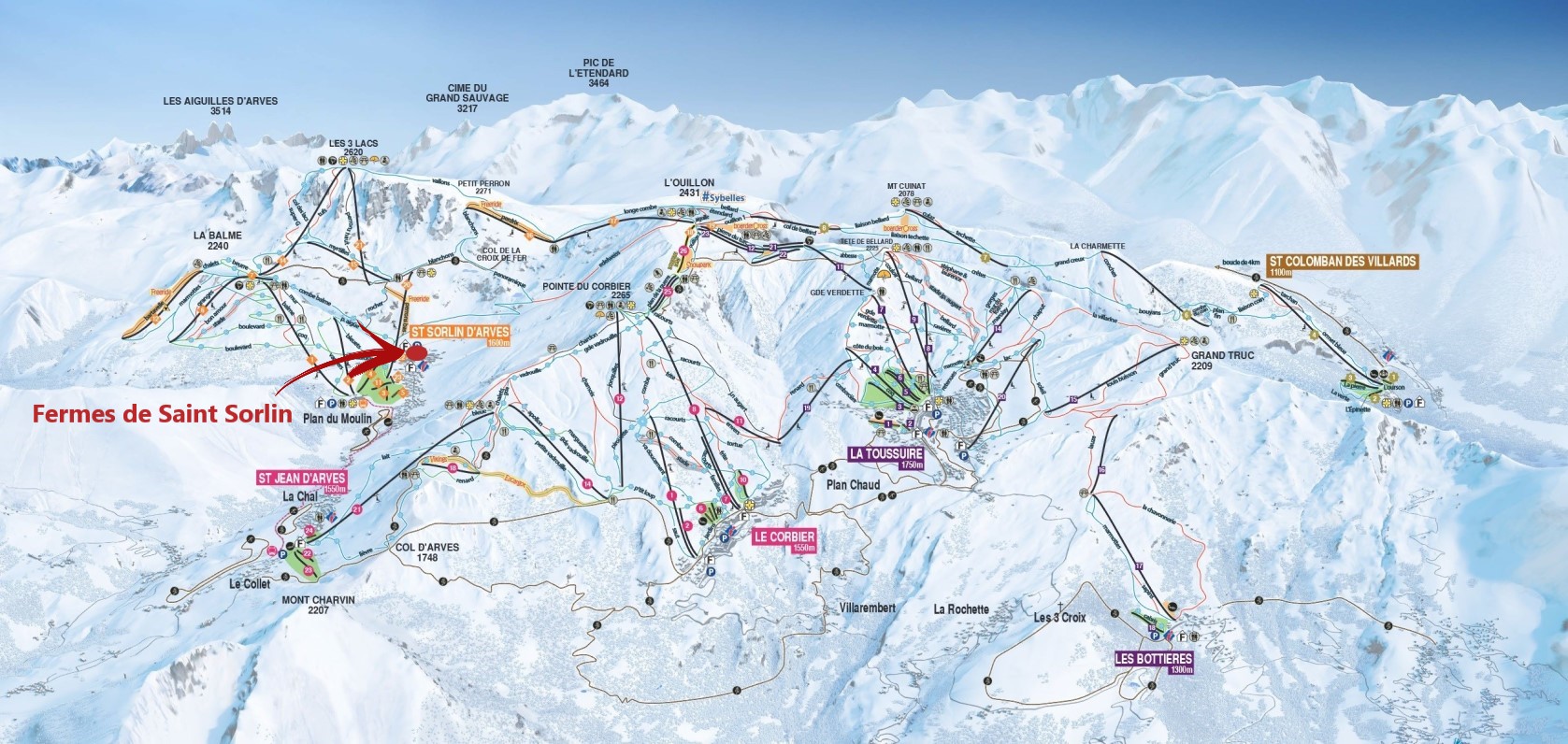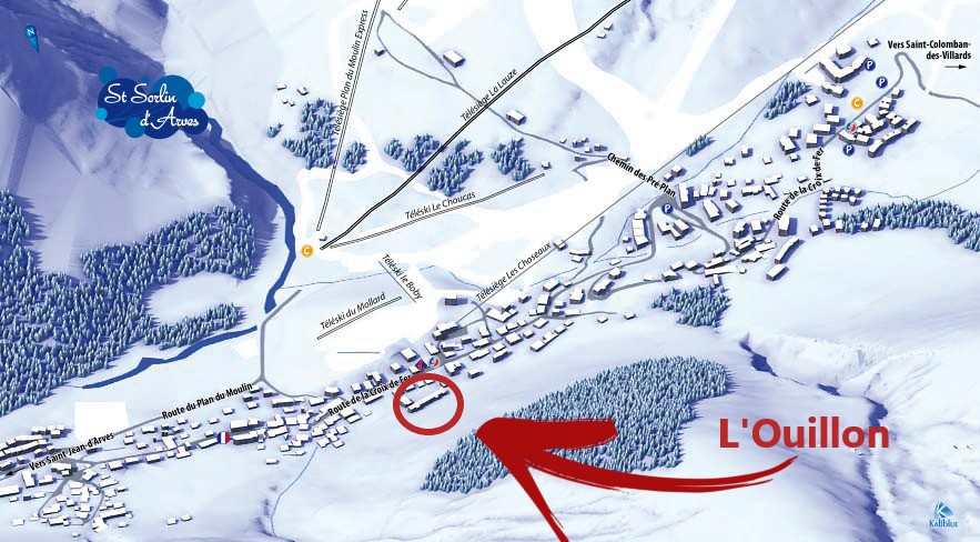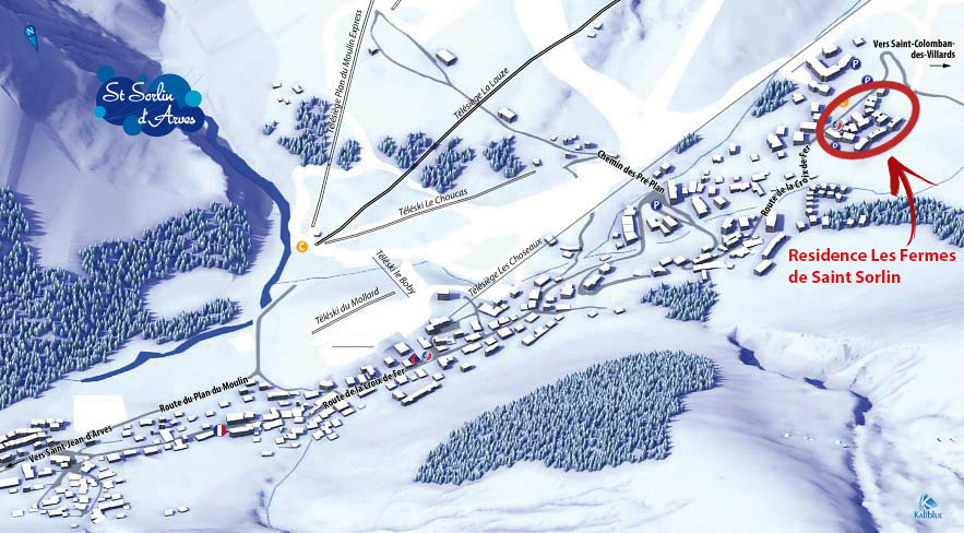 Saint Sorlin-ban járunk, ami a síterep messze leghangulatosabb falva, sok szórakozási lehetőséggel, hangulatos utcácskákkal, árusokkal. A Les Fermes (a pajták) apartmanház-komplexum a falu tetején található, majdnem a pályák mellett. Nevével ellentétben emberek téli elszállásolására is alkalmasnak alakították ki! Sőt, egyenesen hangulatos, fűtött, fedett apartmanok várnak a több, kisebb épületben.